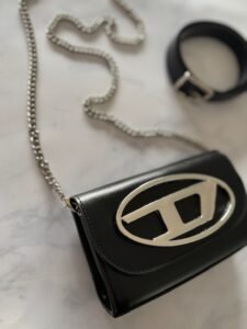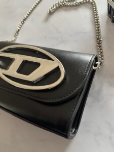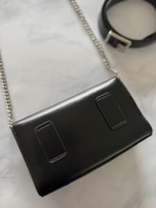 - Posee una correa de cadena plateada desmontrable, para usar como bandolera
